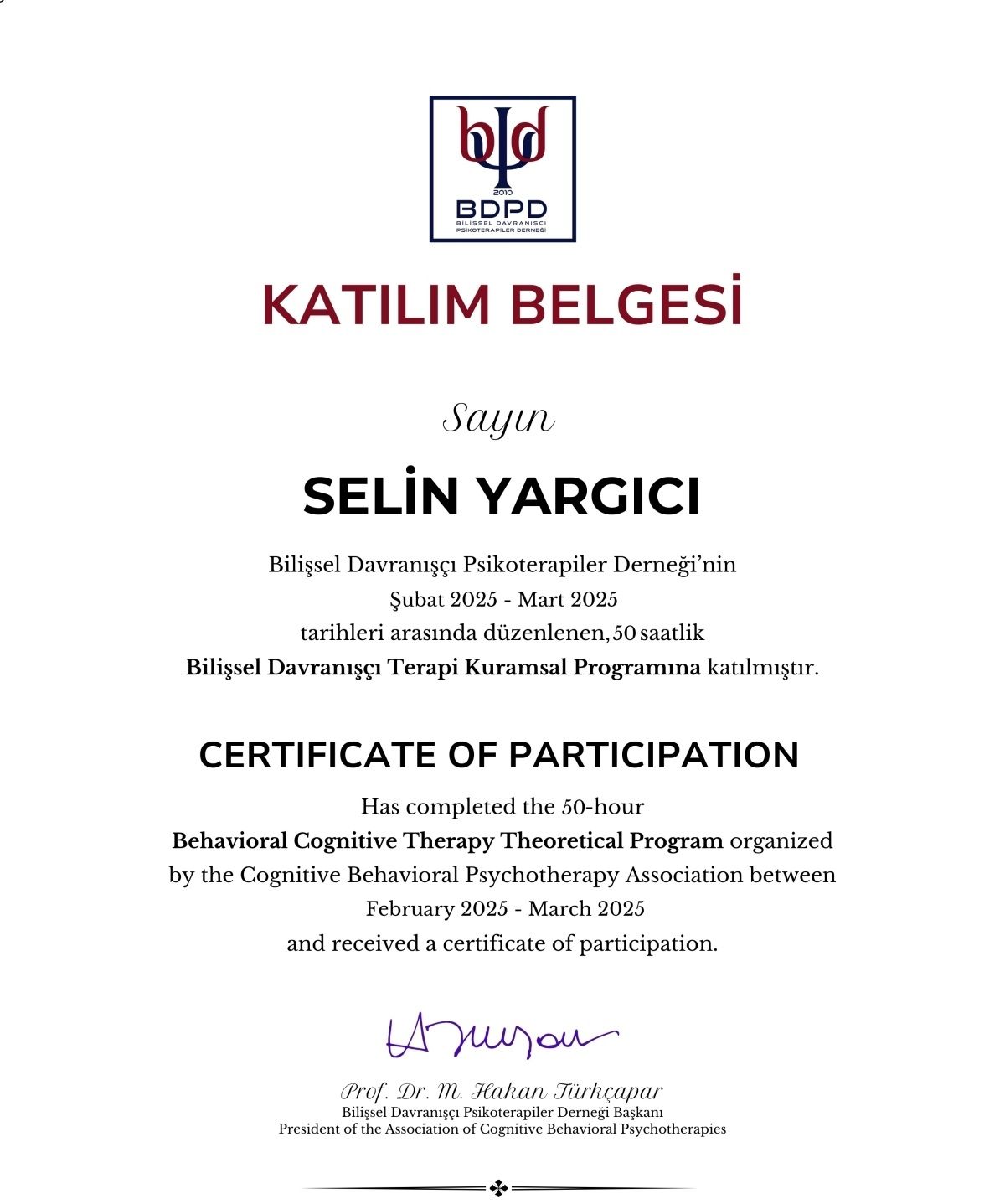 2025 yılında Bilişsel Davranışçı Psikoterapiler Derneği’nden, Dr. Hakan Türkçapar